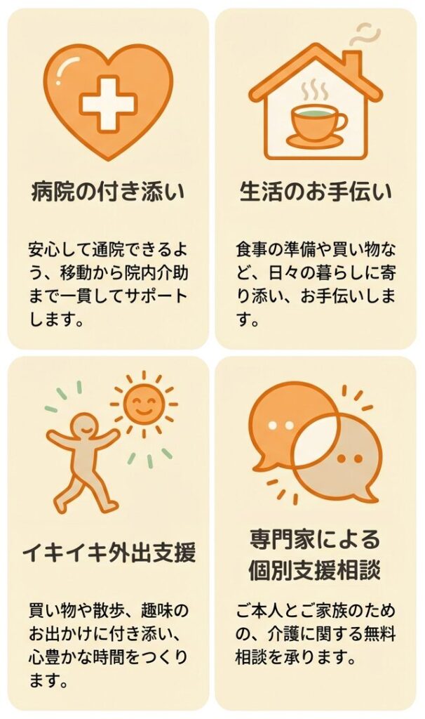 お答えはい、ご利用いただけます。介護保険の枠組みでは手が届かない「ちょっとした困りごと」や、自立した生活を送られているアクティブシニアの方の「やりたい」を形にするのが私たちの役割です。