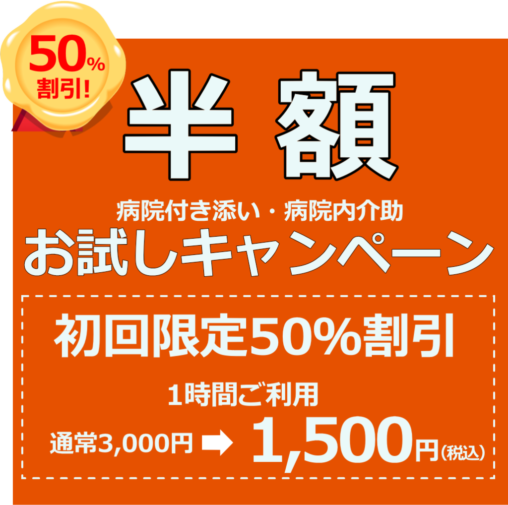 只今「通院付き添い・病院内介助」お試しキャンペーンを実施しています。