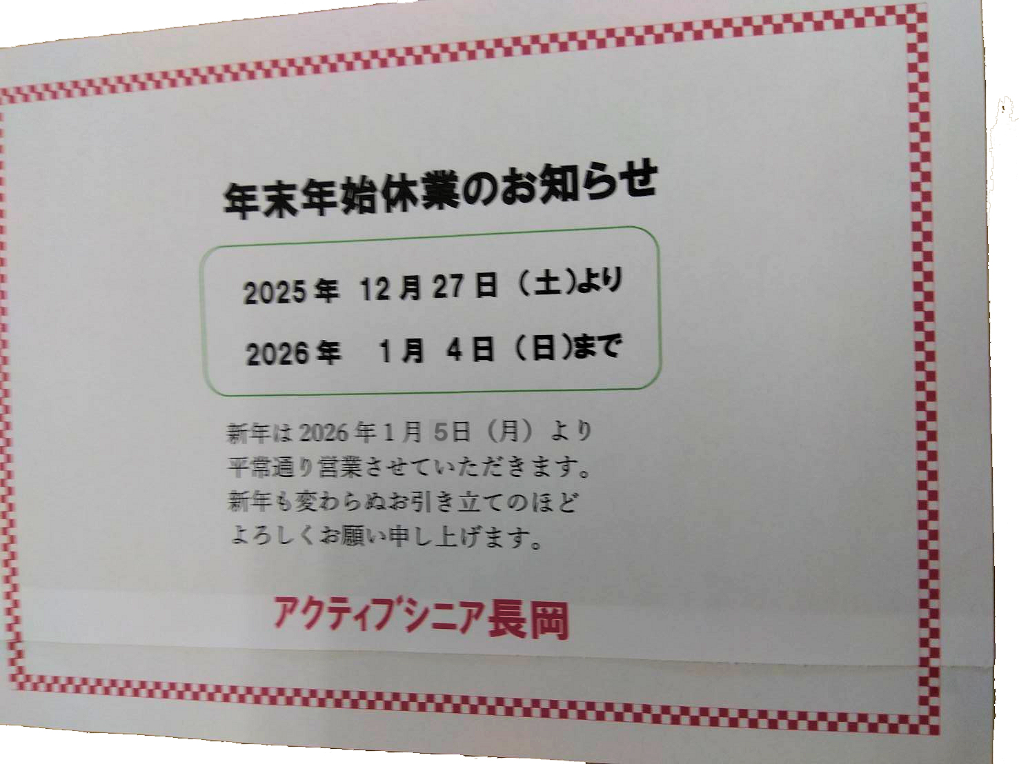 2025年12月27日(土)より2026年1月4日(日)まで休業致します。